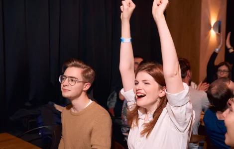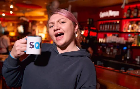 SQUIZ - это игра на эрудицию и логику в барах по вечерам или онлайн, в которой сражаются команды от 2 до 8 человек. Вопросы зачитываются ведущим и дублируются на экранах, ответы команды вписывают в бланки и сдают их в конце раундов. В одной игре соревнуются в среднем по 20-40 команд.
